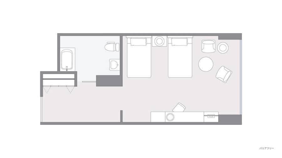 | 設備 | 空調控制/床鋪/浴室與淋浴/洗手間/智慧電視/客房內Wi-Fi(免費)/室內保險箱/IDD國際直撥電話/電熱水壺/咖啡與紅茶組/吹風機/居家服與拖鞋/浴巾/面巾/手巾/鞋刷與鞋拔 |