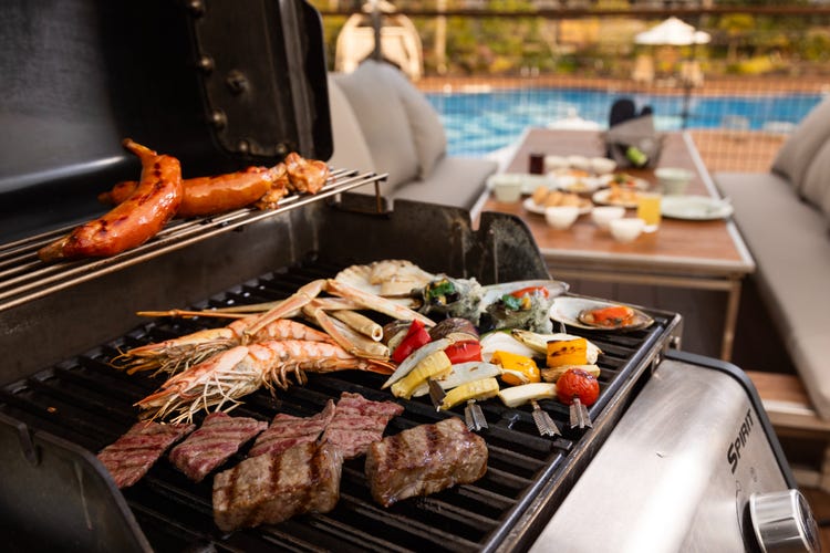 擺滿豐富多彩菜品的自助早餐。豐富的外帶晚餐。燒烤也是。
