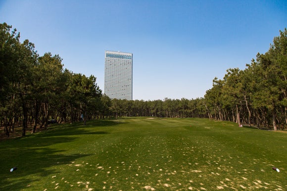 左狗腿洞的長洞。發球區上第一桿的目標是從球道中心向右側擊球。果嶺的右側有沙坑,所以從中央瞄準左側吧。